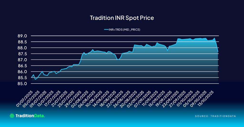 “Since the 23rd of September, the INR has been relatively stable, sitting around 88.72 per dollar. However, on Tuesday last week, the Rupee Spot rate fell to an all-time low of 88.8 before opening 1.27% stronger – at 87.669 – on Thursday. This rebound was a result of both the RBI’s intervention and growing optimism that a potential trade deal will be completed this month as the Indian Prime Minister Narendra Modi pledged to stop buying oil imports from Russia, enforcing the continued interest in INR Rates which has occurred throughout 2025.” Saracen Fletcher, APAC Product Development & Strategy.